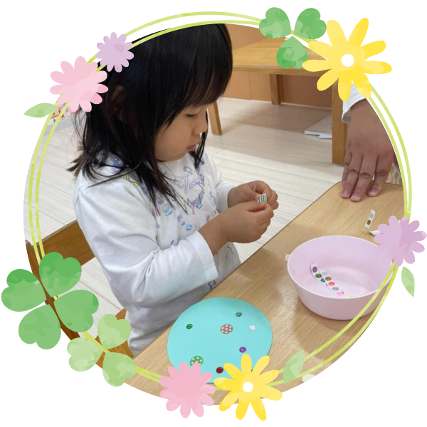 | 10:00 | モンテッソーリ活動(日常生活) お散歩、戸外遊び、造形遊び、音楽遊び、表現遊び |